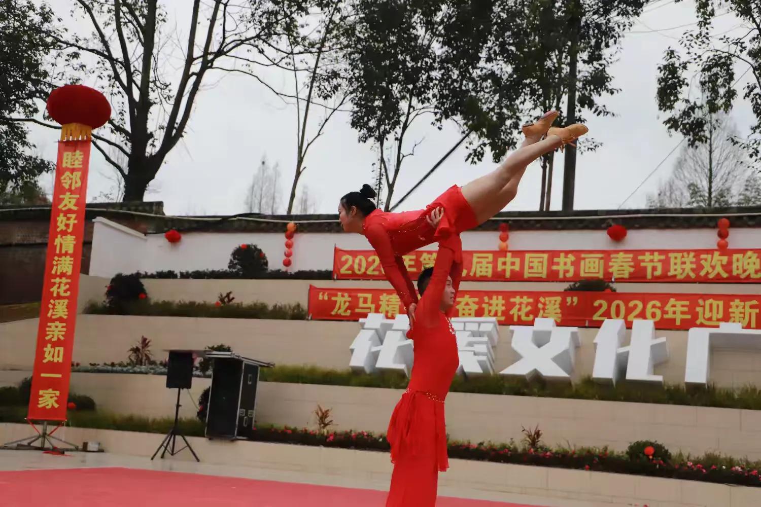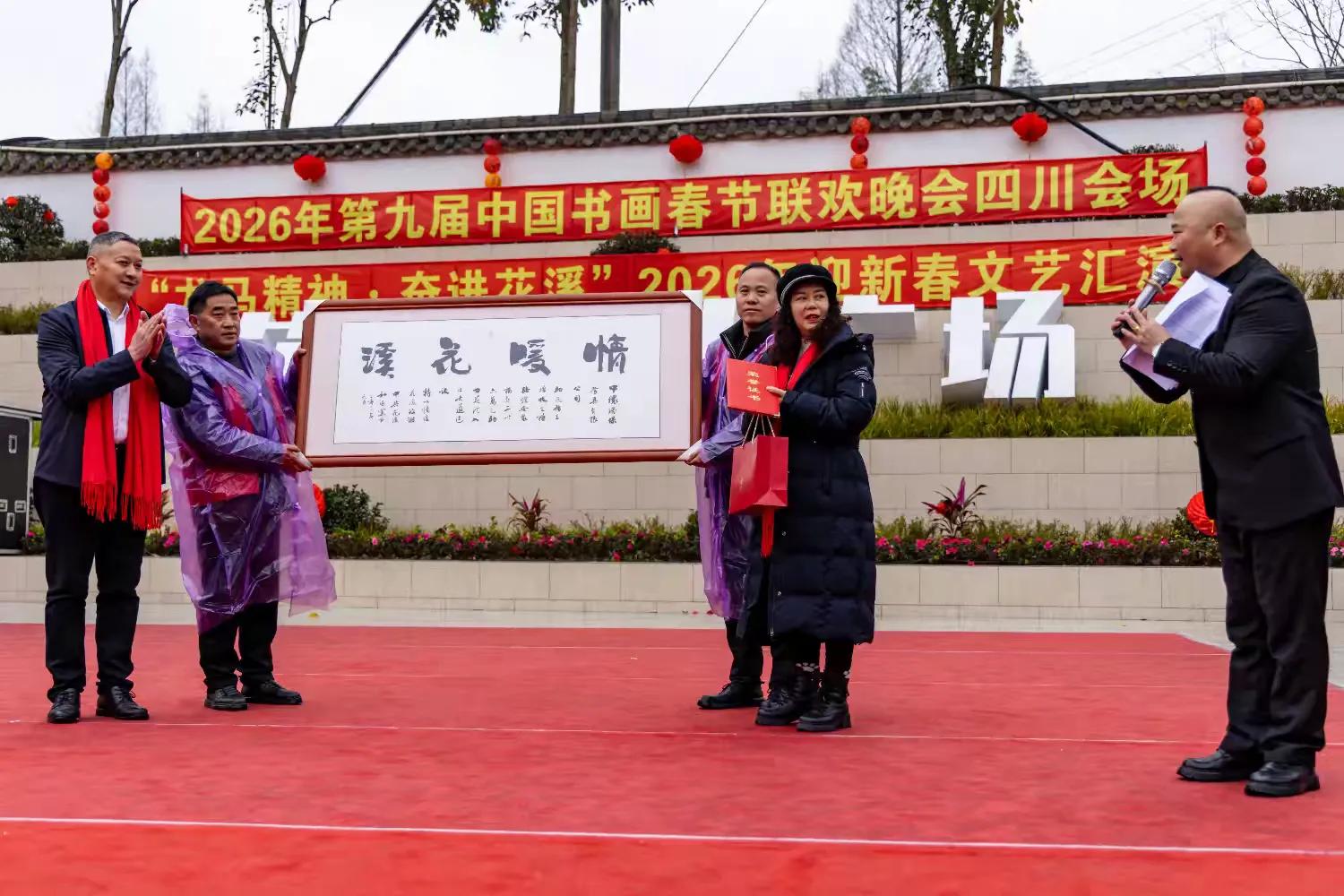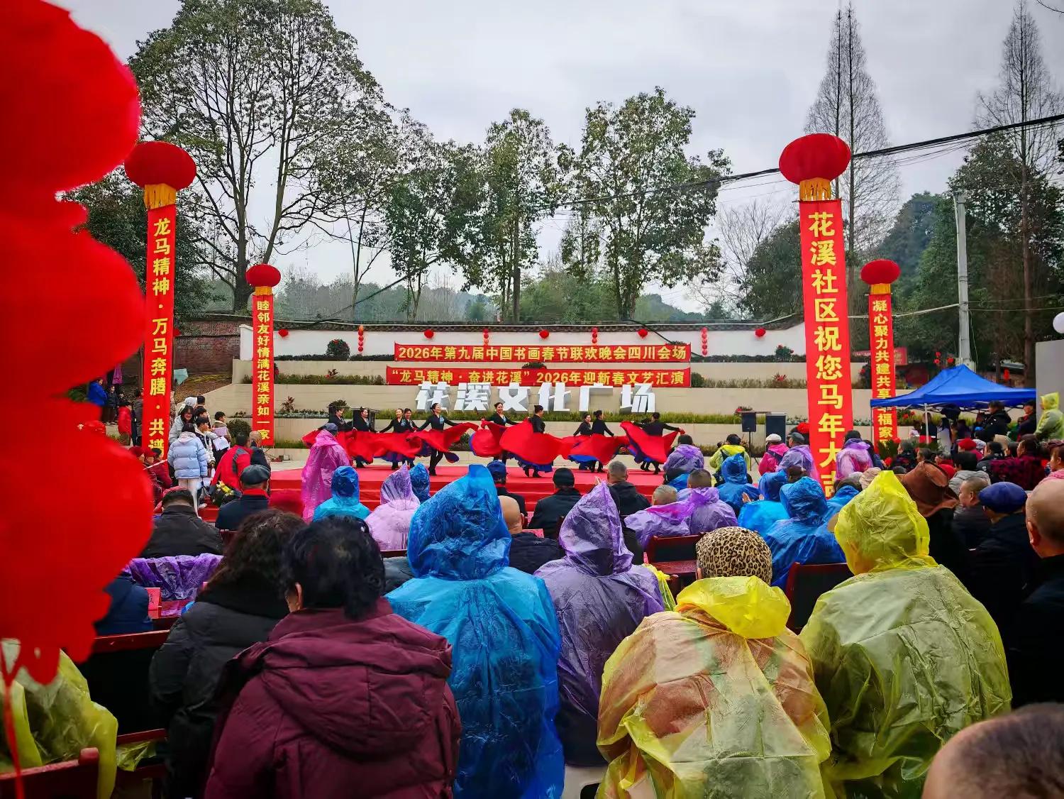书画春晚报讯:春寒料峭,暖意更浓;红灯缀巷,年味渐酣。2月7日,第九届中国书画春节联欢晚会四川会场暨“龙马精神·奋进花溪”2026年迎新春文艺汇演在都江堰市花溪社区堰上青城文化广场圆满落幕。本次活动由花溪社区党委主办,青海生茂房地产有限公司、中环餐具公司协办,以““丹青国韵,翰墨千秋”、“龙马精神,奋进花溪”为核心,既是书画的盛会,也是花溪社区致敬新春、凝聚民心的文化盛会,为辖区居民奉上了一场兼具传统韵味与时代气息的文化大餐。