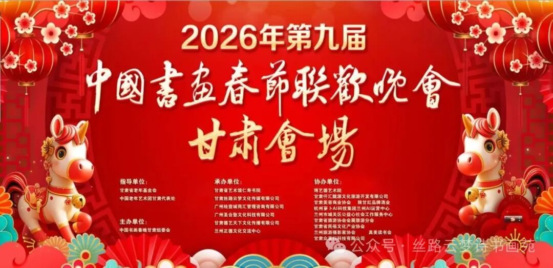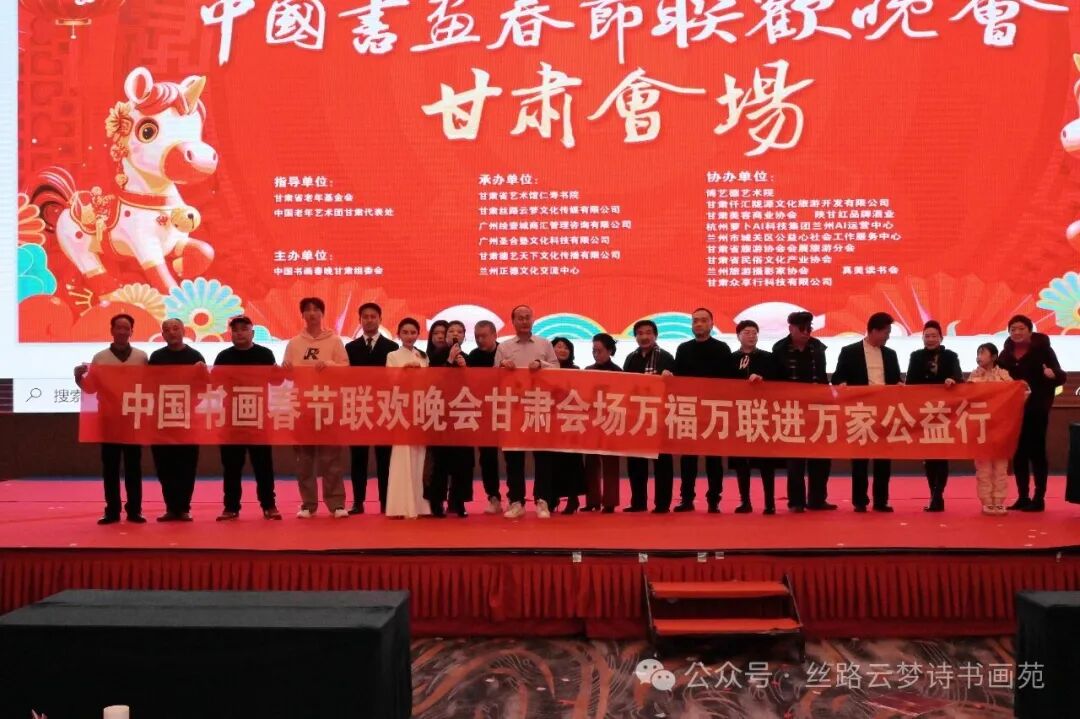 书画春晚快讯:2026年2月10日,第九届中国书画春节联欢晚会甘肃会场在金城兰州隆重启幕。这场根植丝路、赓续文脉的文化盛事,以九载深耕之厚积,融书画雅韵、民俗风情、时代新声于一体,五百余位书画名家、文艺翘楚与各界嘉宾齐聚黄河之滨,以笔为旗、以墨为韵、以艺为媒,共贺新春、共传文脉、共谱陇原文旅融合新篇章,本届盛会由中国书画春晚甘肃组委会主办,甘肃省老年基金会、中国老年艺术团甘肃代表处指导,甘肃省艺术馆,仁寿书院,甘肃丝路云梦文化传媒有限公司,广州绘壹城商汇管理咨询有限公司等多家单位联合承办,博艺德艺术院,甘肃君创书画院,甘肃博润书画院,真美读书会、甘肃仟汇陇源文化旅游开发有限公司、甘肃众享行科技有限公司、甘肃省民俗文化产业协会、兰州旅游摄影家协会、兰州市城关区公益心社会工作服务中心等多家协办。