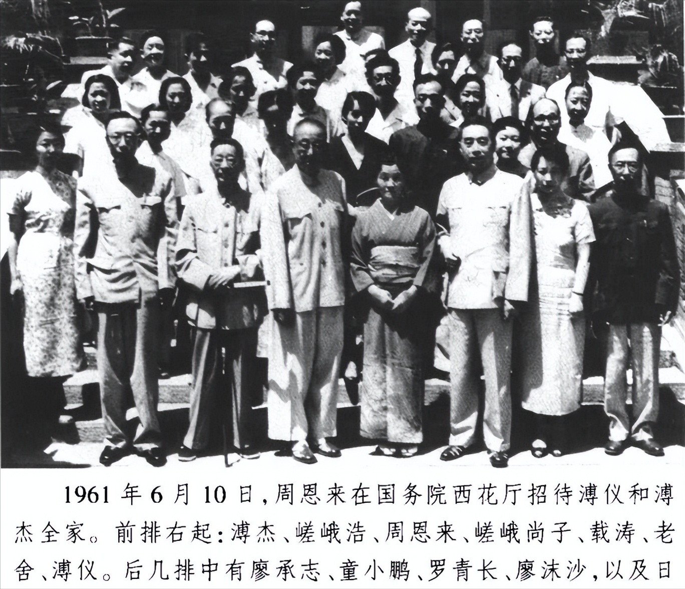事情还没有完结。1961年5月,我的妻子带着次女嫮生,在母亲嵯峨尚子、妹妹町田千子的陪同下来到了北京。迎接她们的不只是按周总理指示修缮一新的西城护国寺那座四合院幽静的住宅,而且周总理又拨出整天的时间在中南海西花厅会见我一家三口和日本亲属,并宴请溥仪、载涛等爱新觉罗家族。