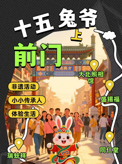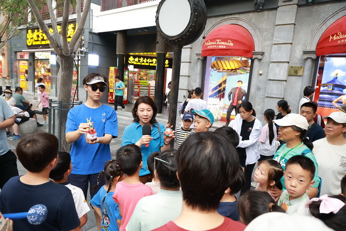 国家级非遗北京泥人张项目市级代表性传承人姚晓静在前门大街,和中小学生一起再现《十五的兔儿爷上前门》经典场景。