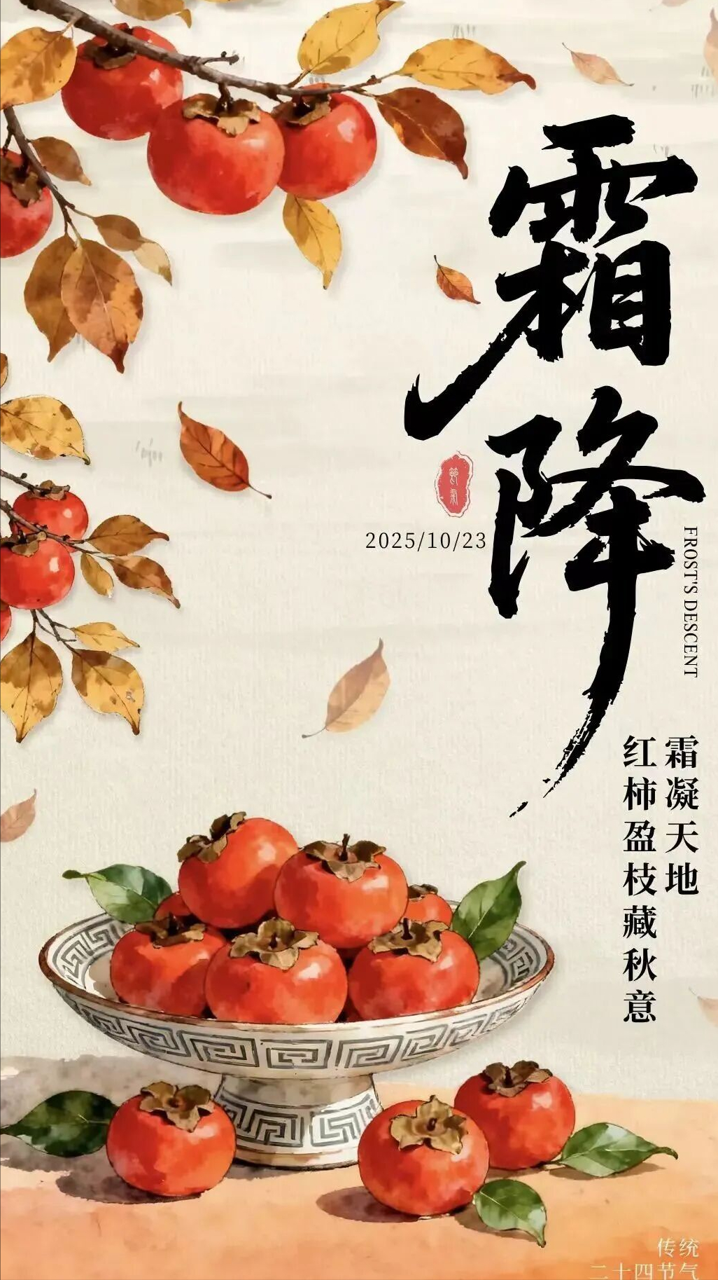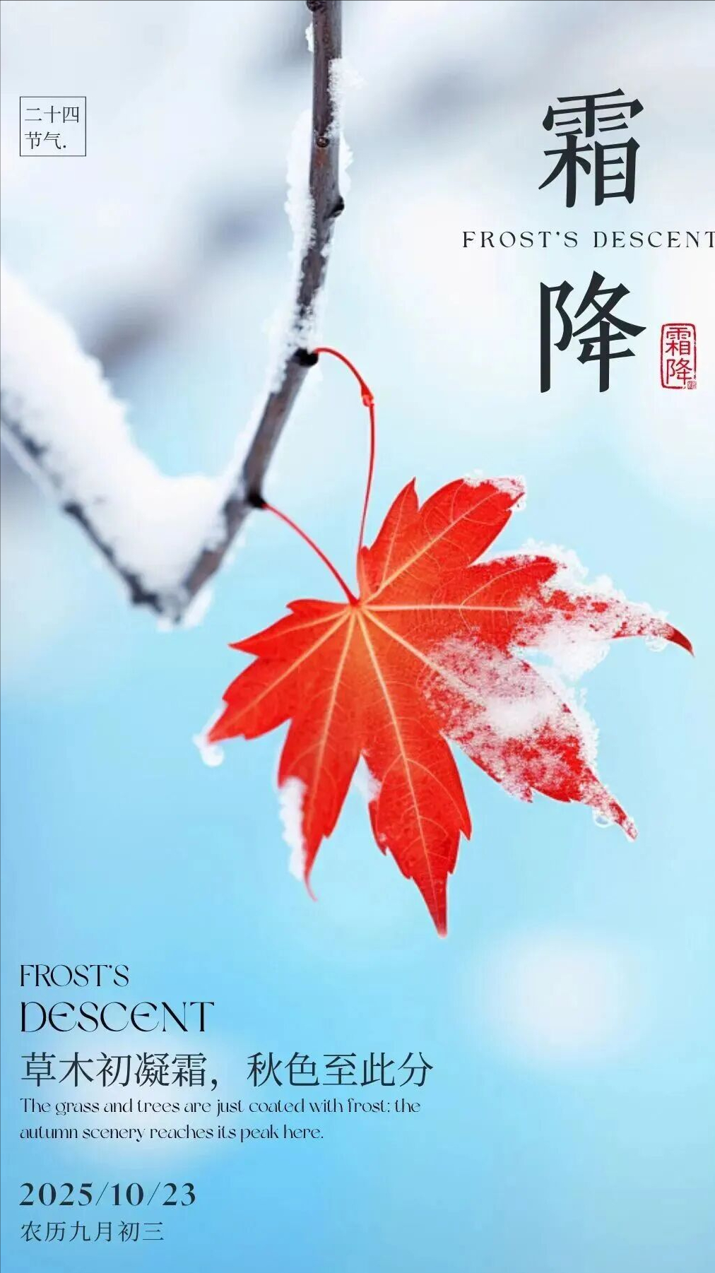 [摘要] 秋暮霜华浓霜降二十四节气中的第18个节气,秋季的第6个节气。每年公历10月22日—10月24日之间,太阳到达黄经210°时。“降”并非指“霜”从天上降下,而是指气温骤降、昼夜温差大,近地面水汽遇冷凝结成霜。01霜降气候· 气温骤降:此时冷空气活动频繁,气温比之前的“寒露”节气下降得更快,所谓“寒露不算冷,霜降变了天”