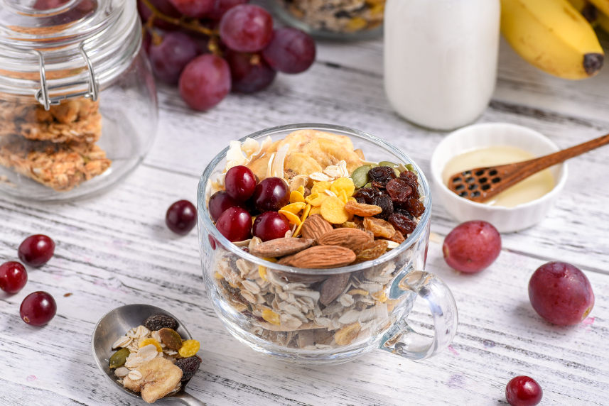 坚果的果仁如核桃、栗子、杏仁、花生、黑芝麻、南瓜子等都含有油酸脂和亚油酸脂,是促进大脑发育和加强思维能力的佳品,尤其是核桃和黑芝麻,还含有丰富的B族维生素。干果中龙眼有补心脾、益气血、助精神之功效,能辅治失眠、健忘、神衰,故被赞为"益智果";荔枝对大脑细胞有补益作用;两者都能防止大脑机能衰退。枣子含糖量很高,亦有利补益大脑。
