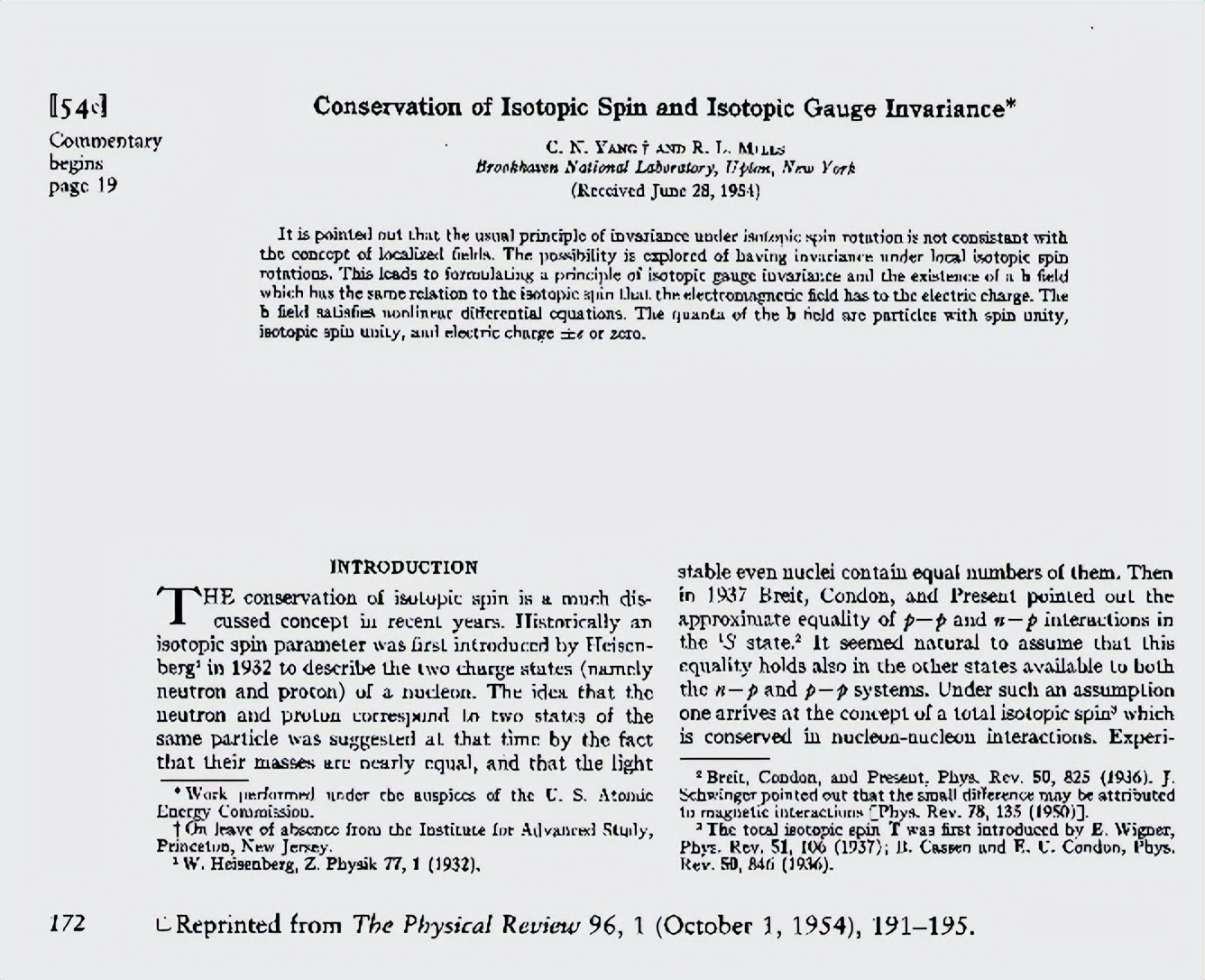 1954年杨振宁与米尔斯关于“非阿贝尔规范场”的论文