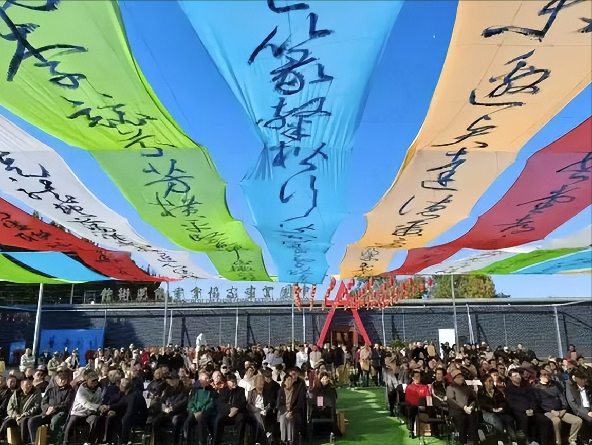 开幕式现场的布置就是神来之笔——在西集国际艺术园区的露天,1000多平的会场上方被五彩绸幅覆盖成天幕,绸幅上是用地书笔草书的《兰亭序》全篇。微风拂过,天幕抖成一排排缤纷的字浪——太壮阔了!太有创意了!我一向认为震撼的效果只属于“运河音乐节”这样的动感艺术,而静态的书展居然也震撼起来了,我从没见过,确实颠覆了我对艺术形式的认知。更有意思的是,这一创新并非刻意的匠心独运,而是妙手偶得。王士杰先生最初只是想弄个天幕遮阳,又突发奇想:既然是书法展为什么不在上面写字呢?于是,便把绸幅铺在地上奋笔五六个小时;于是,便有了露天的和展厅内的草书五彩天幕,成就了一个人人喝彩叫绝的奇观。其实,这种妙手偶得不是凭空而得,而是长期艺术积累才有的灵光一现,是一种必得。