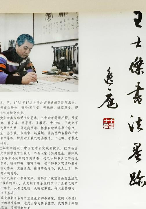 王士杰先生幼承家学,书法家父亲王文华为他启蒙,他最深的儿时记忆是空气中弥漫的墨味。上世纪九十年代他又有幸认识国学大师、红学会会长、著名诗人、书画家冯其庸先生,并拜其门下。63岁的王士杰先生临池不辍已60载矣,退休后每天秉笔10小时更是常态,有名师指路,又下了铁杵磨针的功夫,其书法艺术怎能不精湛!冯其庸先生曾赠诗对爱徒大加赞勉:“学书如参禅,十年破一关,待到穷尽处,心花在眼前。”